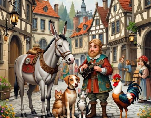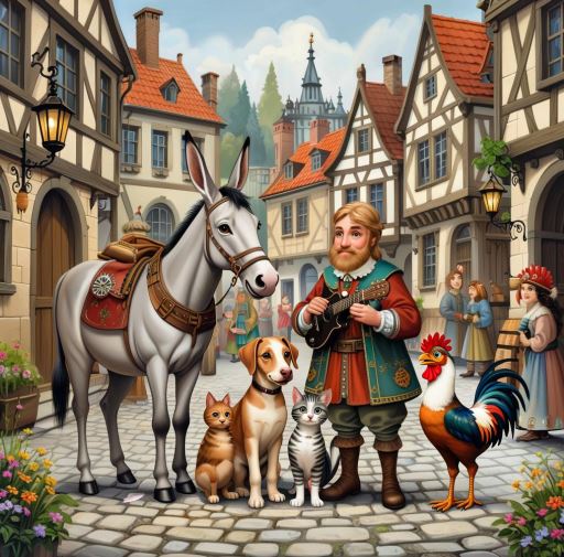 Осел, собака, кот и петух оказались ненужными своим хозяевам и отправились в Бремен, чтобы стать музыкантами. По пути они забрели в лес и увидели дом разбойников. Животные встали друг на друга и запели свою страшную песню. Испуганные разбойники убежали из дома, приняв музыкантов за страшное чудовище. Звери остались жить в доме и зажили счастливо.