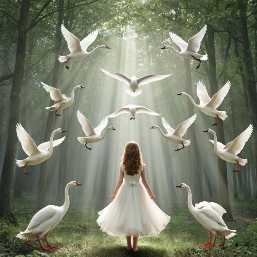 У короля было одиннадцать сыновей и одна дочь Элиза. После смерти жены он женился на злой колдунье, которая превратила принцев в лебедей, а Элизу изгнала из замка.