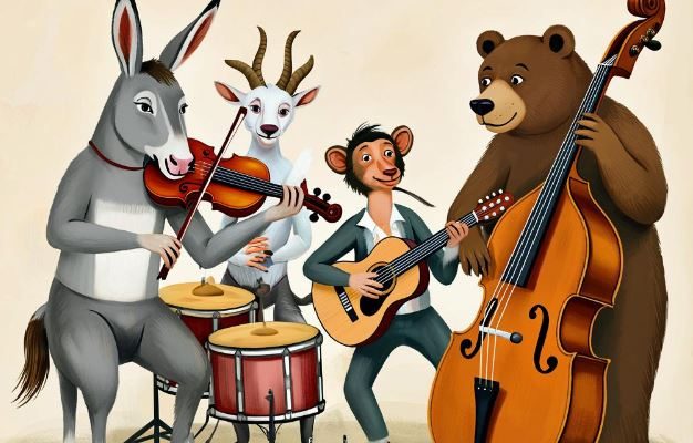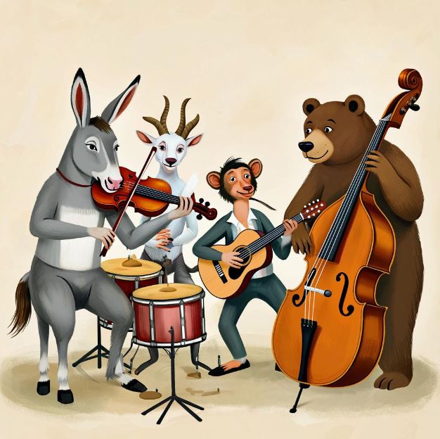 Четверо животных — Мартышка, Осёл, Козёл и Медведь — решают создать музыкальный квартет. Они раздобыли инструменты и ноты, но вместо прекрасной музыки у них получается лишь ужасный шум.