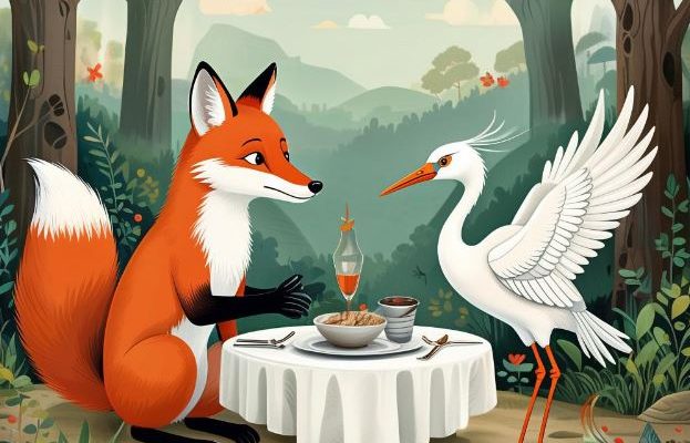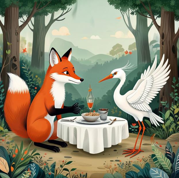 Лиса подружилась с Журавлем и пригласила его в гости. Она наварила манной каши и размазала её по тарелке, чтобы Журавль не смог её есть своим длинным клювом. Журавль остался голодным, но не показал виду.