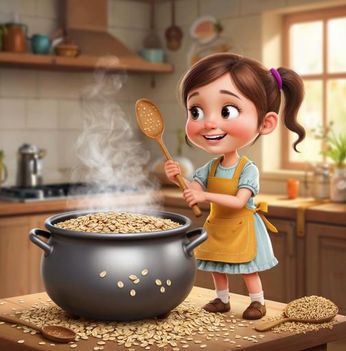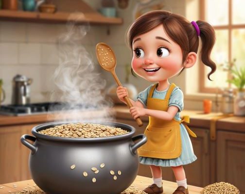 Бедная девочка получает волшебный горшочек, который варит сладкую кашу. Однажды мать забывает остановить горшок, и каша заливает весь город. Возвратившаяся девочка останавливает горшок, но жителям приходится пробираться через кашу.